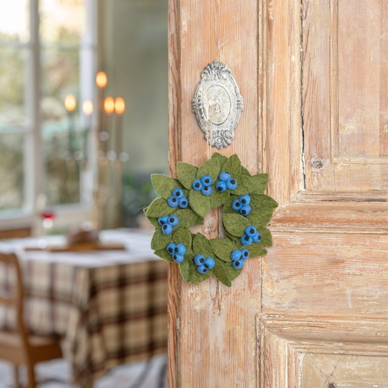 Vilten krans in groen met blauwe besjes, medium formaat. Een sfeervolle decoratie voor aan de muur of in een kransenschaal. Dankzij het lusje eenvoudig op te hangen.