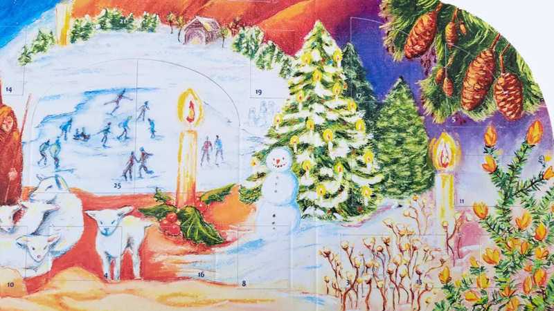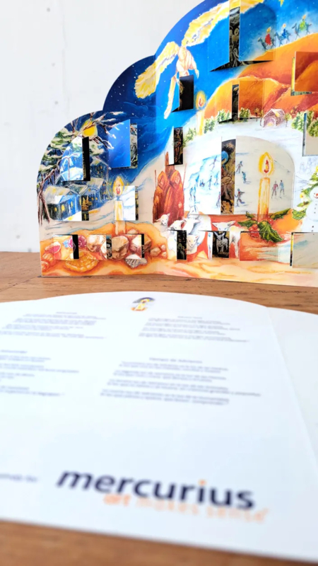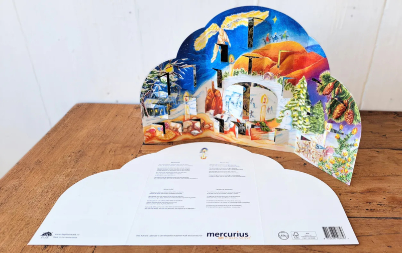Een sfeervolle adventskalender over de vier lichten van advent. Op de voorzijde een tekening gemaakt met pastelkrijt met in totaal 25 luikjes om open te maken, waarin je diverse – oude bekende én nieuwe – bordtekeningen aantreft. Je begint op 1 december en eindigt op 1e kerstdag.