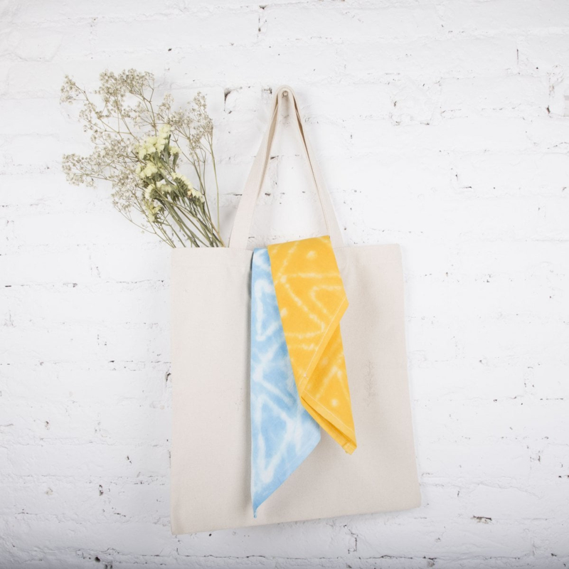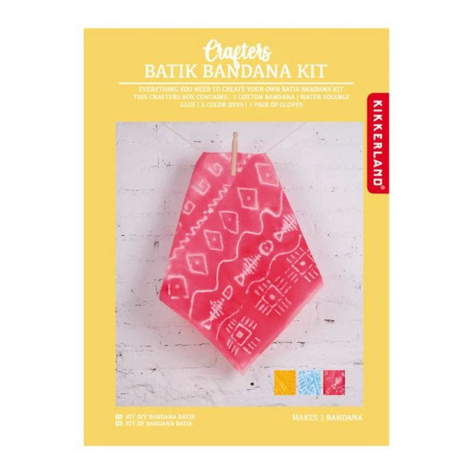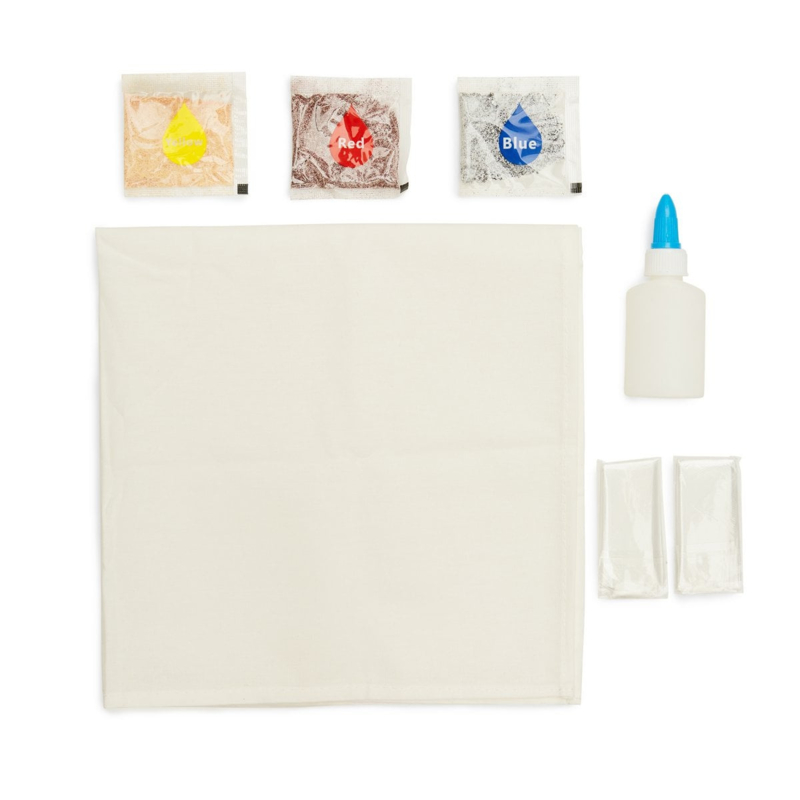 Maak een prachtige handgeverfde bandanaBevat: 1 bandana, lijm, handschoenen, 3 verschillende kleuren kleurstofpoeder: rood, geel, blauw