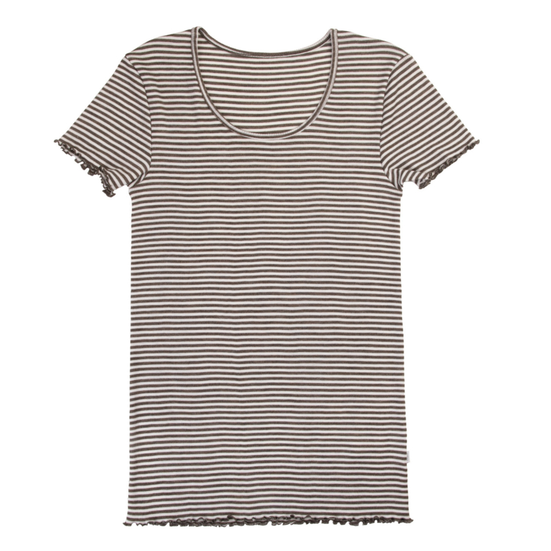 Joha wollen shirt met korte mouwen dames brown stripesGestreept shirt met roezelrandjes